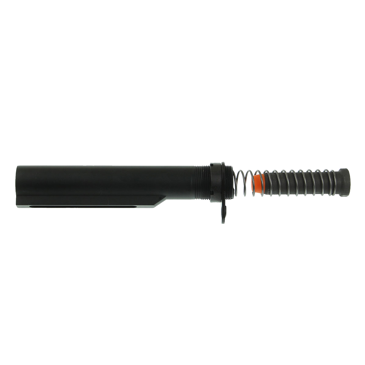 A 5.5oz buffer ensures optimal recoil absorption, paired with a standard carbine length recoil spring made from spring steel, delivering reliable operation during use. Included in the kit are a black castle nut and a phosphate-finished end plate, both designed to securely attach the buffer tube to your firearm. This comprehensive buffer tube kit offers the essential components for gunsmiths seeking dependable functionality and precision in their AR-9 builds.
