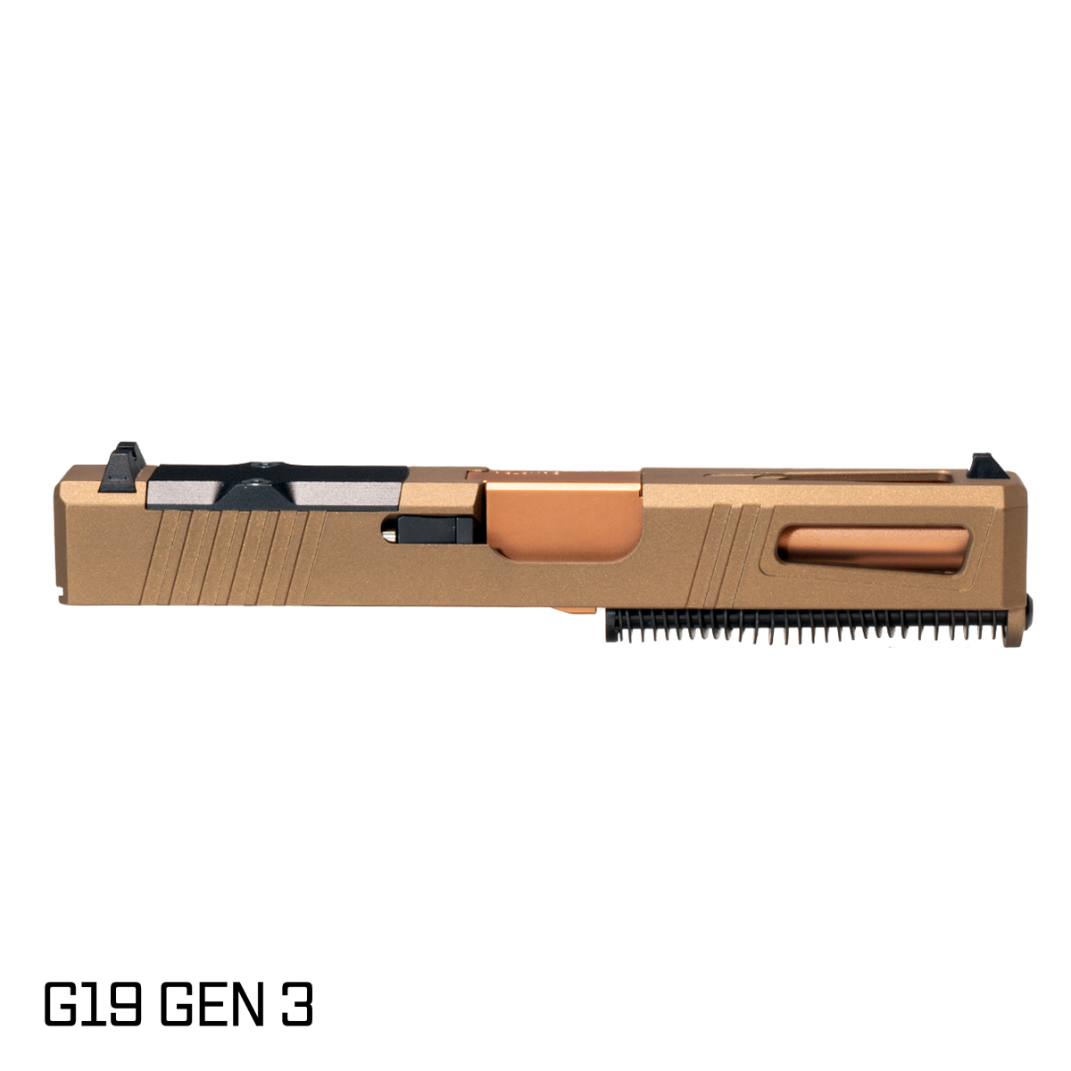 The rear and front serrations facilitate smooth rack-and-chamber operations, while the optics-ready design includes an RMR cut for easy installation of reflex sights. This complete slide kit also includes a match-grade Crown Cut Copper barrel made from 416R stainless steel with a copper PVD finish, delivering optimal accuracy. Weighing a total of 16.37 oz, this slide kit is a perfect combination of functionality and style, making it an excellent choice for custom builds and upgrades.