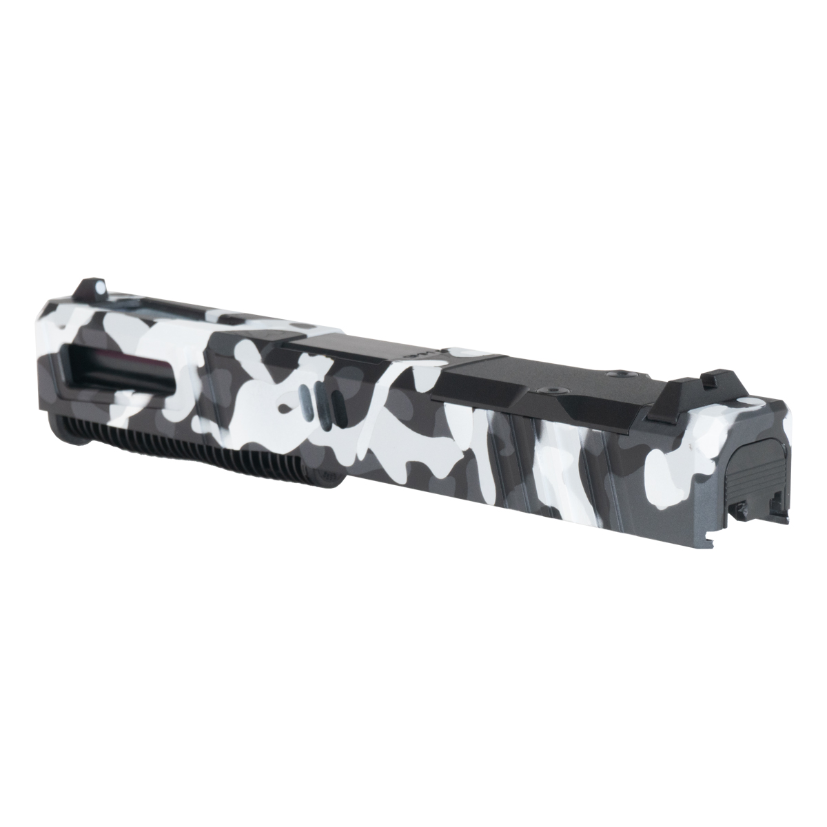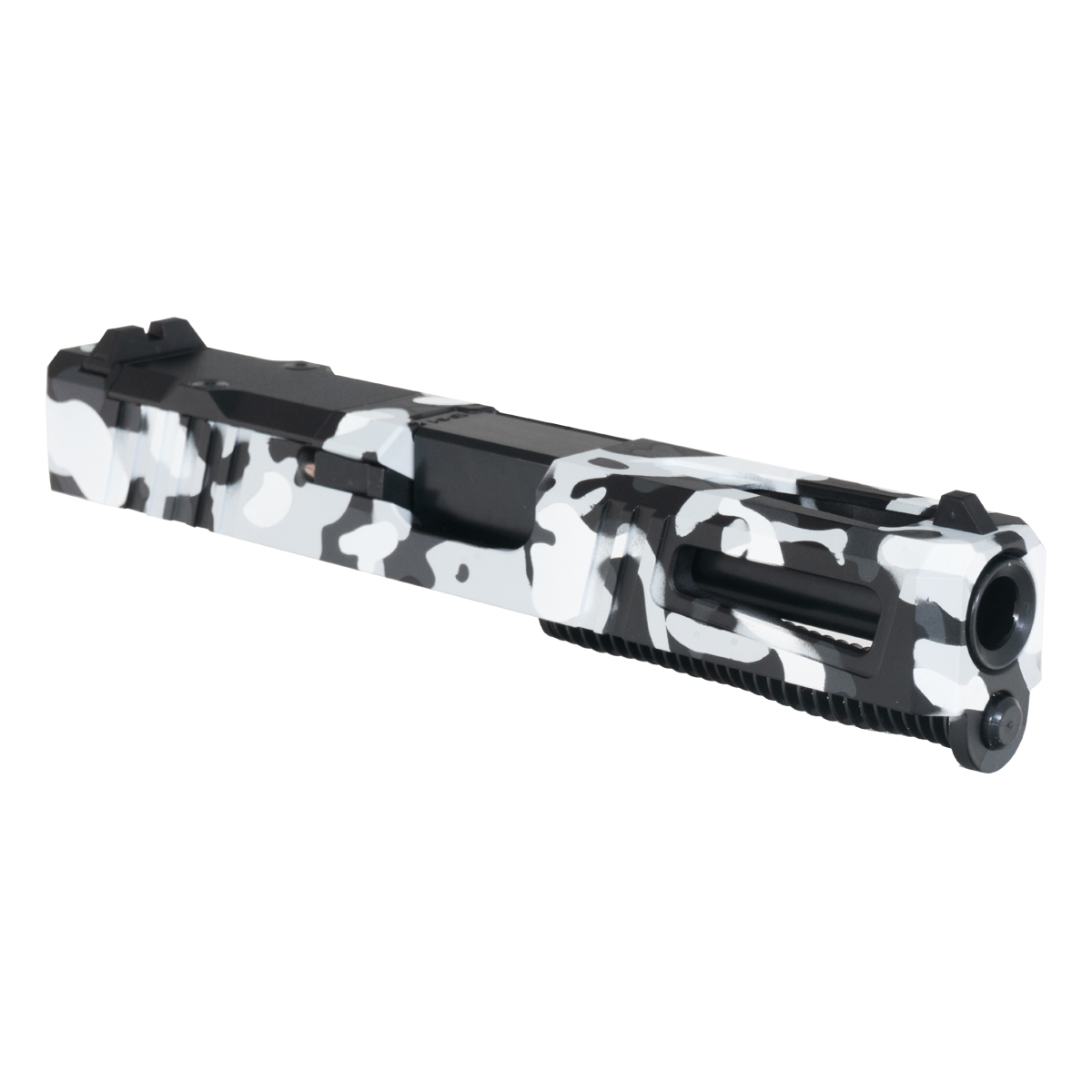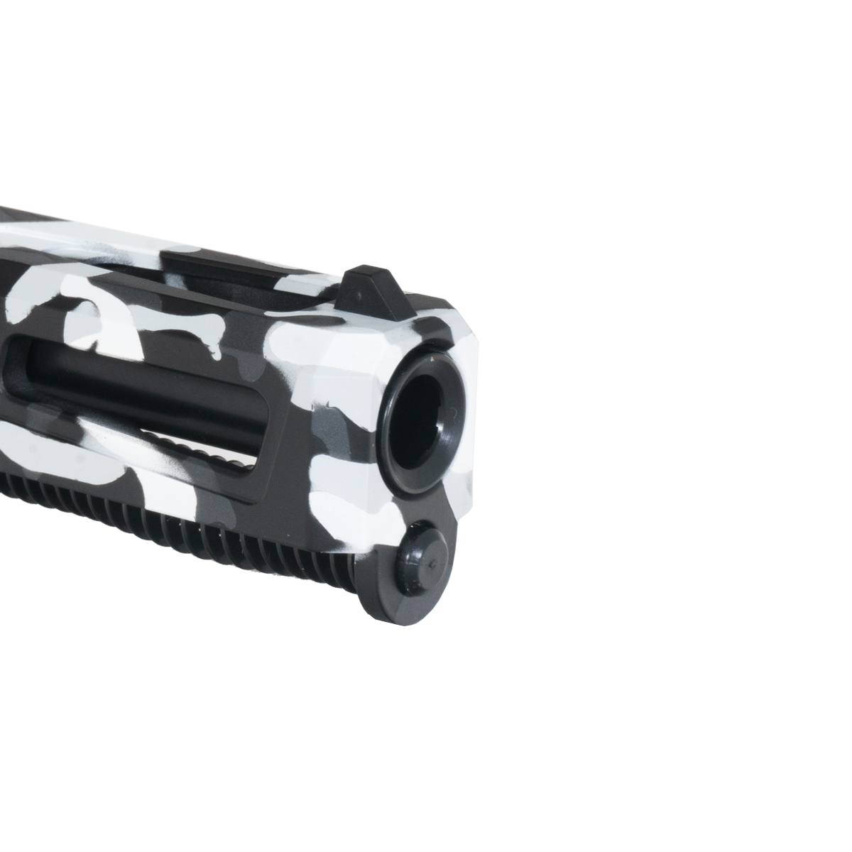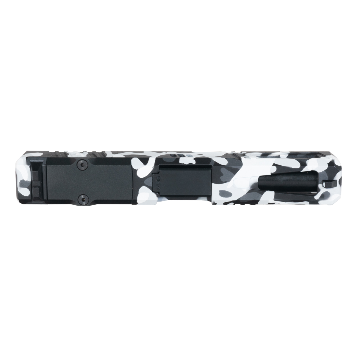The complete slide features a striking winter camo Cerakote finish, providing both aesthetics and protection against the elements. The slide is compatible with Gen 1-3 Glock 19 frames and includes an RMR cut for streamlined optic mounting, accompanied by an aluminum plate cover. Whether for competitive shooting or personal defense, this complete slide kit delivers precision machining and reliable operation, making it an essential firearm accessory for gunsmiths and tactical enthusiasts alike.