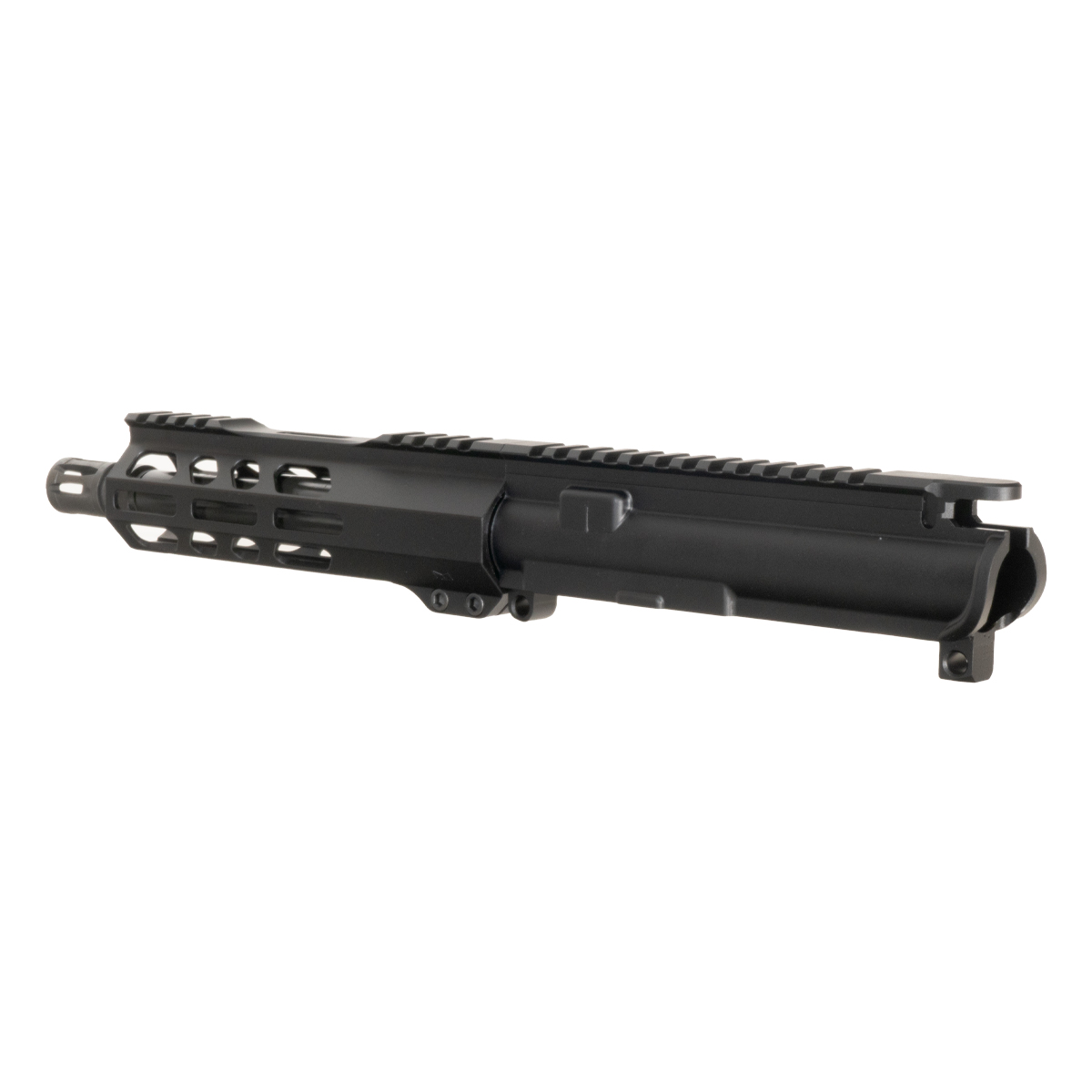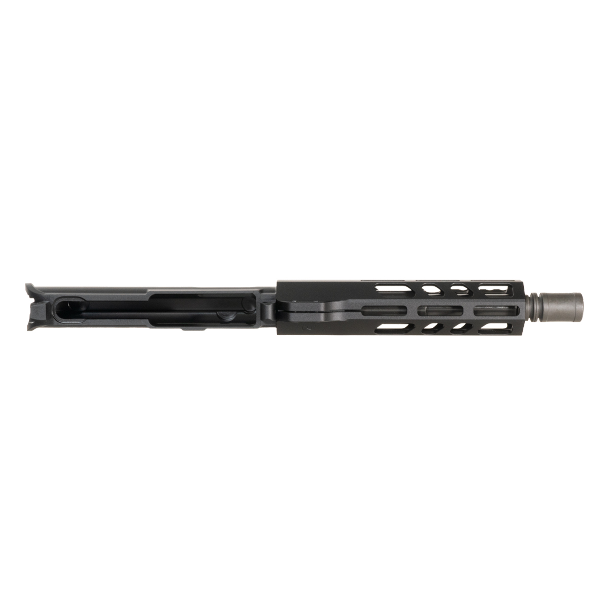 The 7-inch M-Lok freefloat handguard, constructed from lightweight 6061-T6 aluminum in black, allows for customizable accessory mounting. A standard Mil-Spec AR-15 charging handle and a robust 5.5 oz buffer weight complement the build. The kit includes a BTR pistol brace for stability and comfort, alongside a 9mm flash hider muzzle device. This comprehensive kit provides gunsmiths the freedom to build a reliable and compact AR-9 pistol tailored to their specifications.