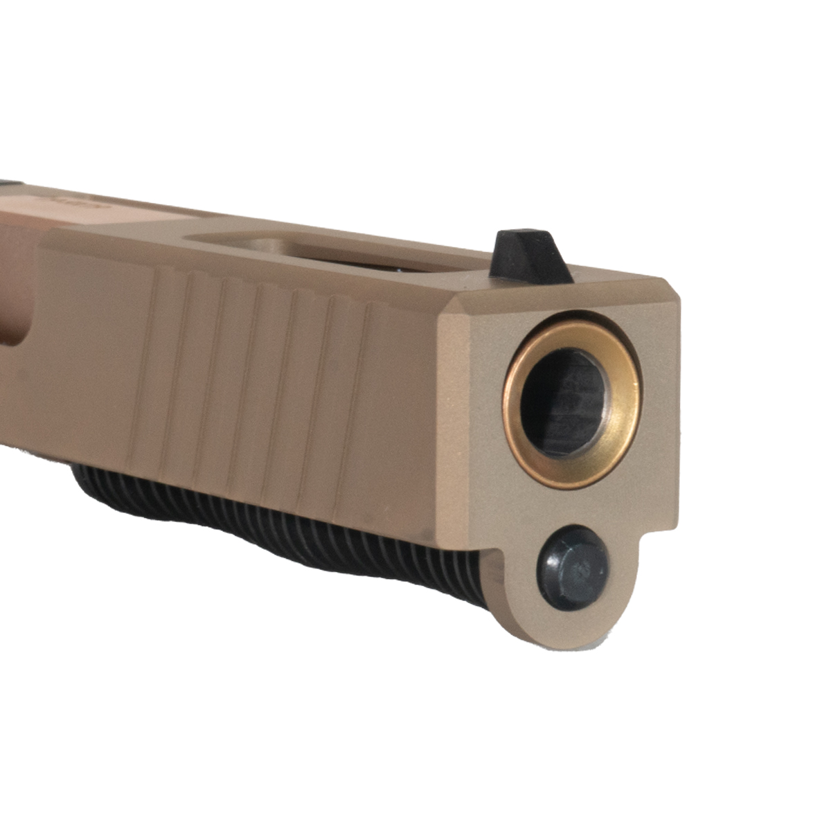 The Packless Copper PVD Barrel G19 Gen 1-3 Compatible 9MM FDE RMR Complete Slide Kit from Davidson Defense is engineered for Glock 19 models, offering a robust shooting solution for discerning gunsmiths. This complete kit features a 416R stainless steel barrel with a PVD finish, ensuring durability and resistance to wear. The barrel is designed in a striking Midnight Bronze color, providing a unique aesthetic without compromising functionality.