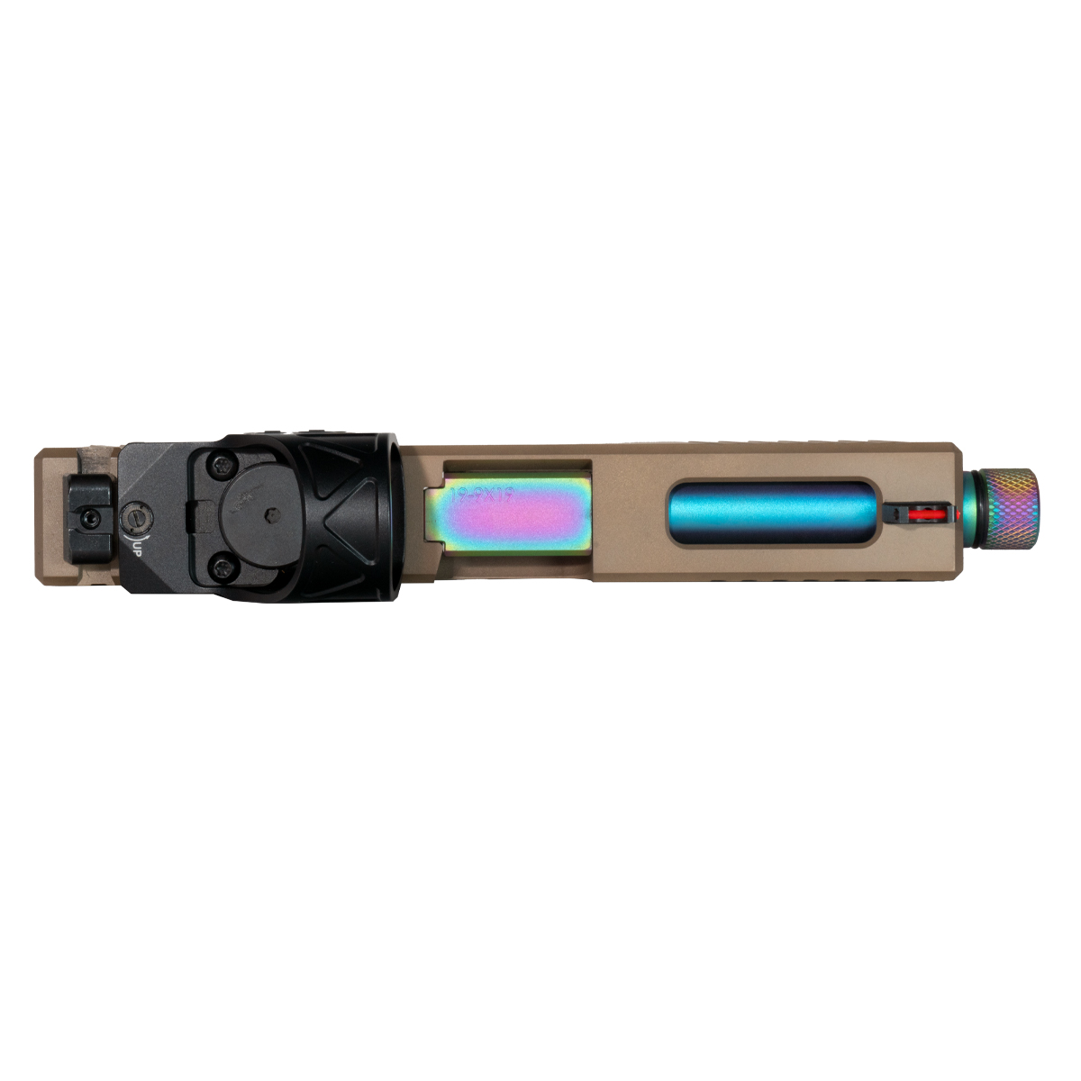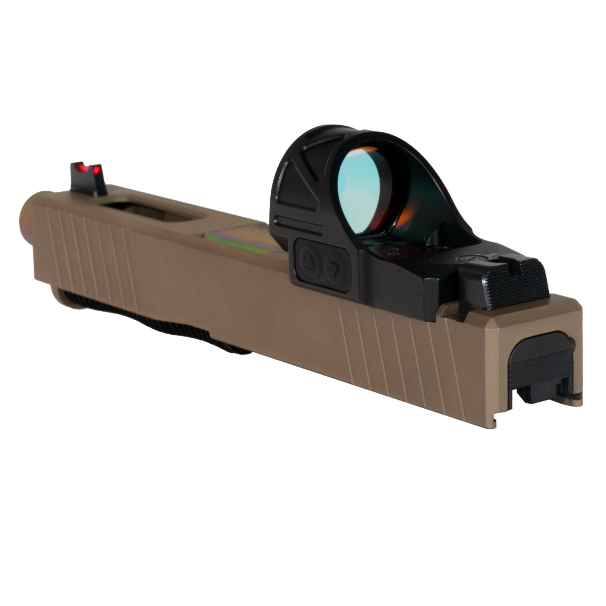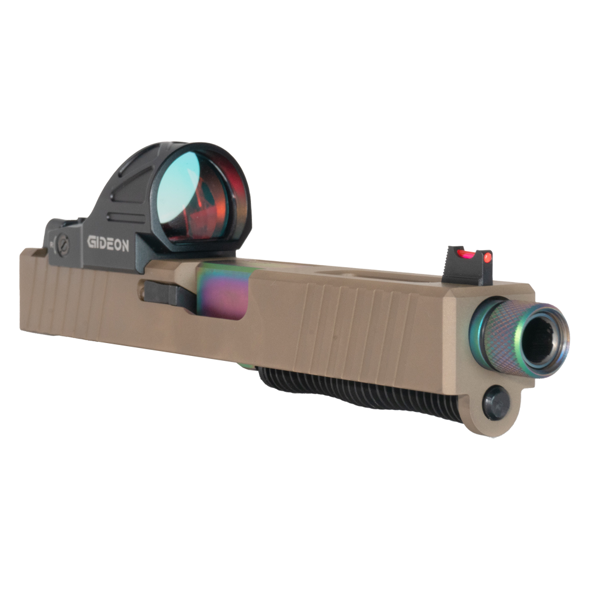 Davidson Defense Packless Threaded Rainbow PVD Barrel G19 Gen 1-3 Compatible 9MM FDE RMR Complete Slide Kit, Gideon Optics Omega (SRO Compatible) Single Red Dot