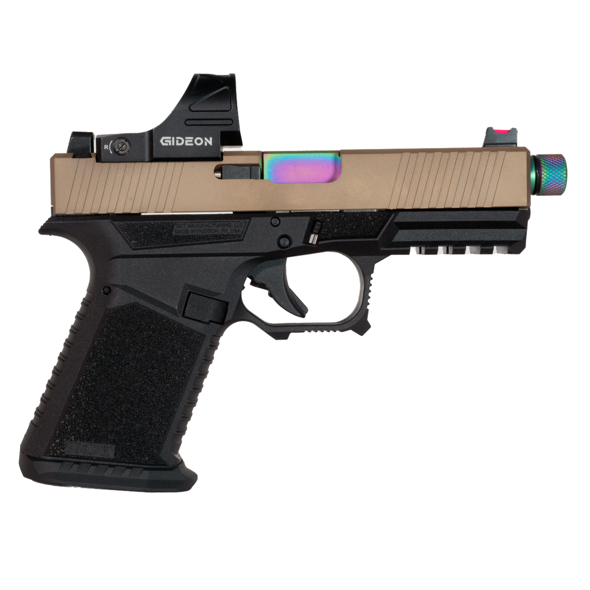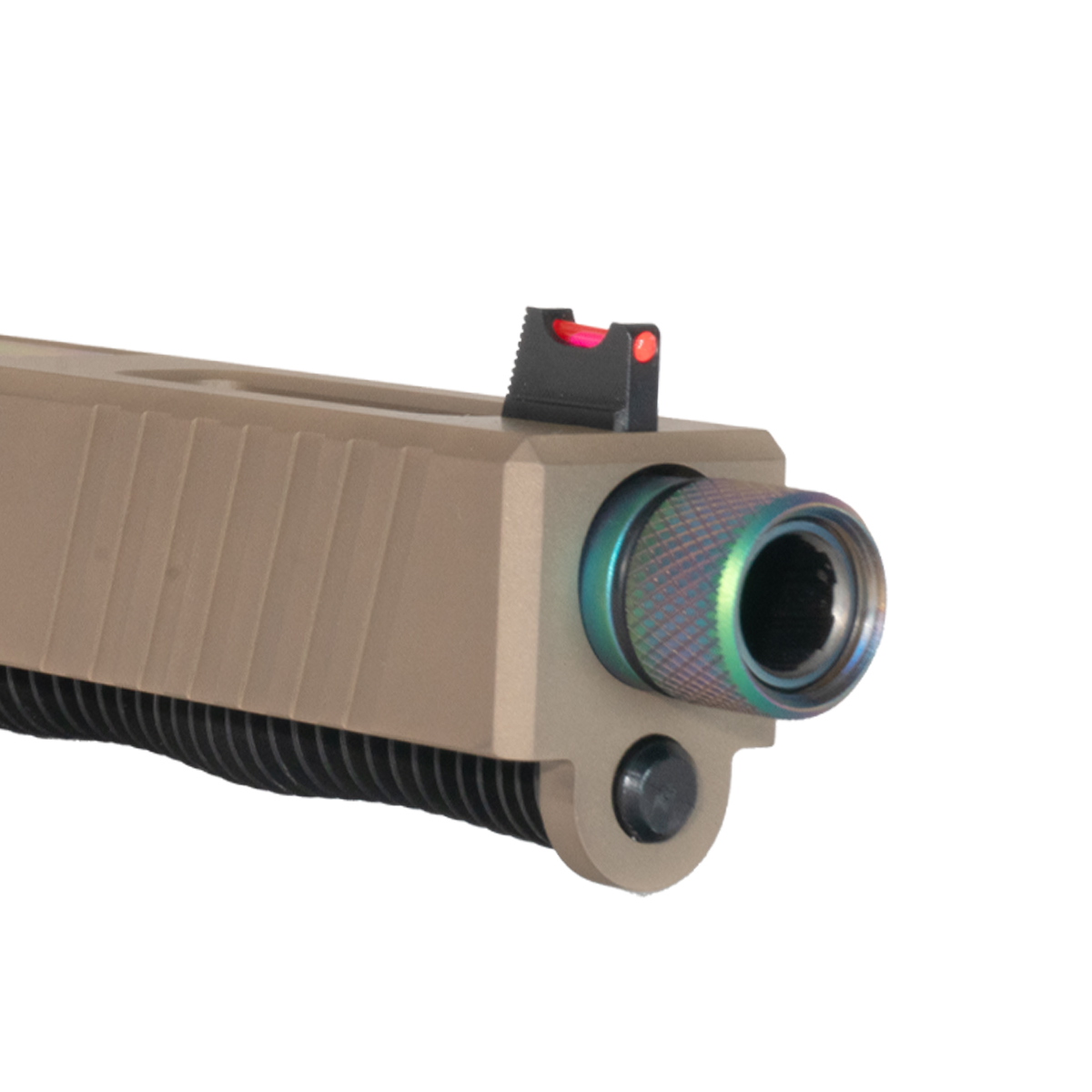 The accompanying slide is a FDE (Flat Dark Earth) serrated design with an RMR cut and window cut, ensuring compatibility with optics such as the Gideon Optics Omega (SRO compatible) single red dot. Additionally, the kit includes a tall profile fiber optic sight tailored for MOS Small Frame setups and features a thread protector for the barrel's muzzle. This complete slide kit integrates functionality and aesthetic appeal for fabricators who advocate for firearm freedom.
