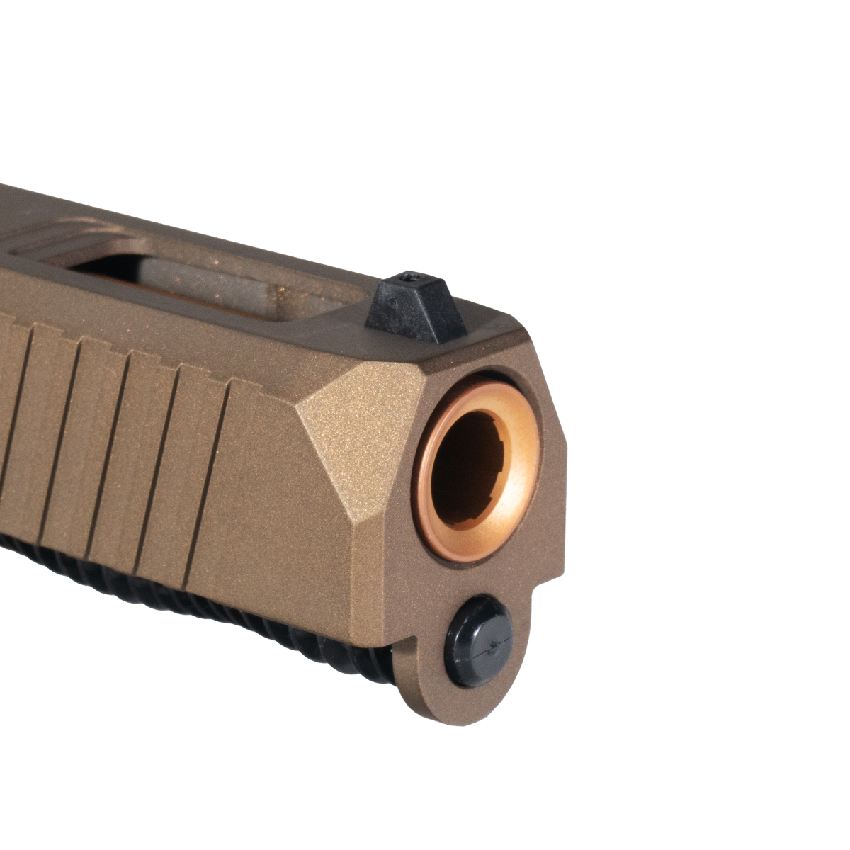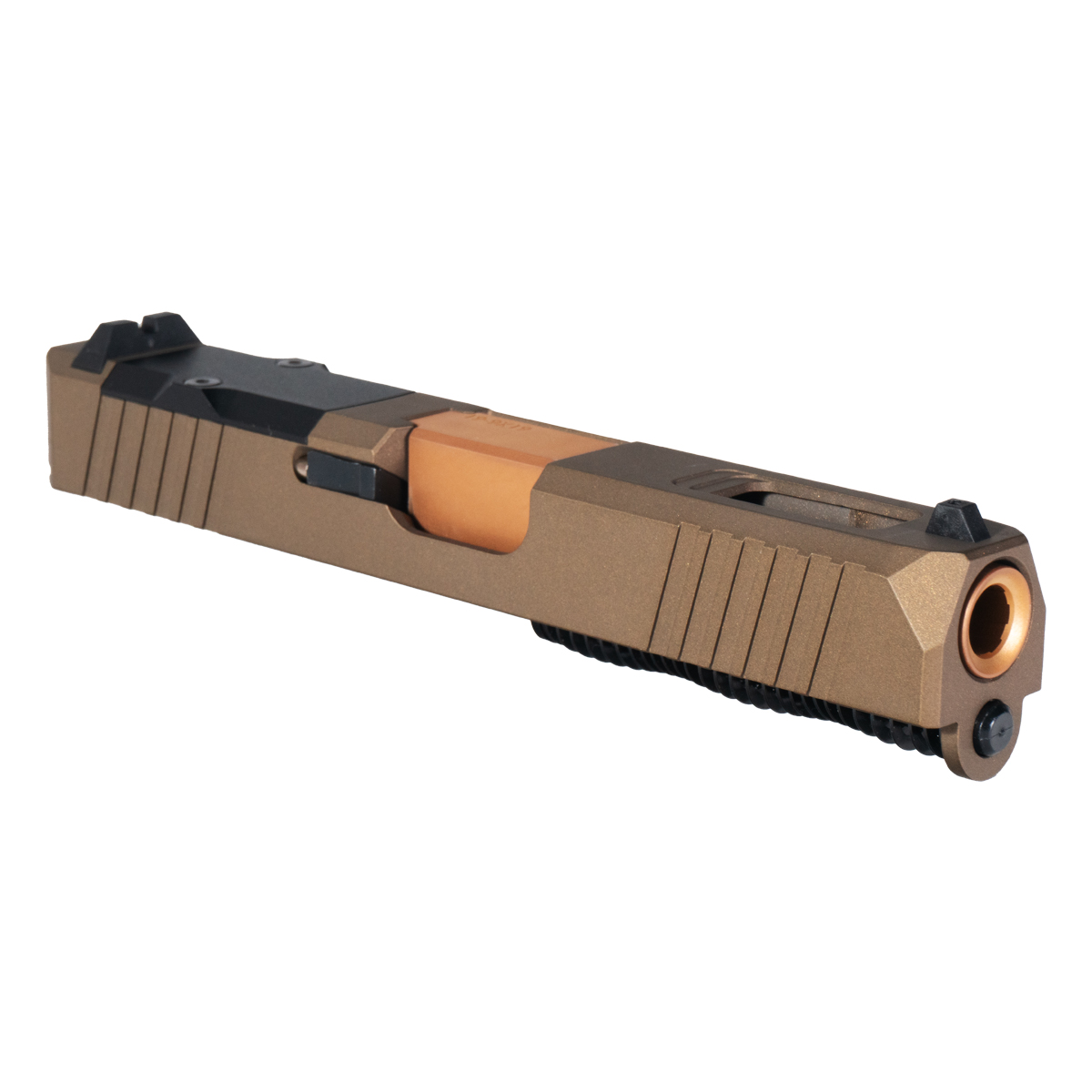 The DTT Stiffler MFG Wayfinder Crowned Copper PVD Barrel G19 Gen 1-3 Compatible Complete Slide Kit is engineered for Glock enthusiasts seeking precision and durability. This kit features a G19 compatible barrel made from 416R stainless steel, showcasing a striking crown cut copper finish with a PVD coating that enhances performance and resistance to wear.